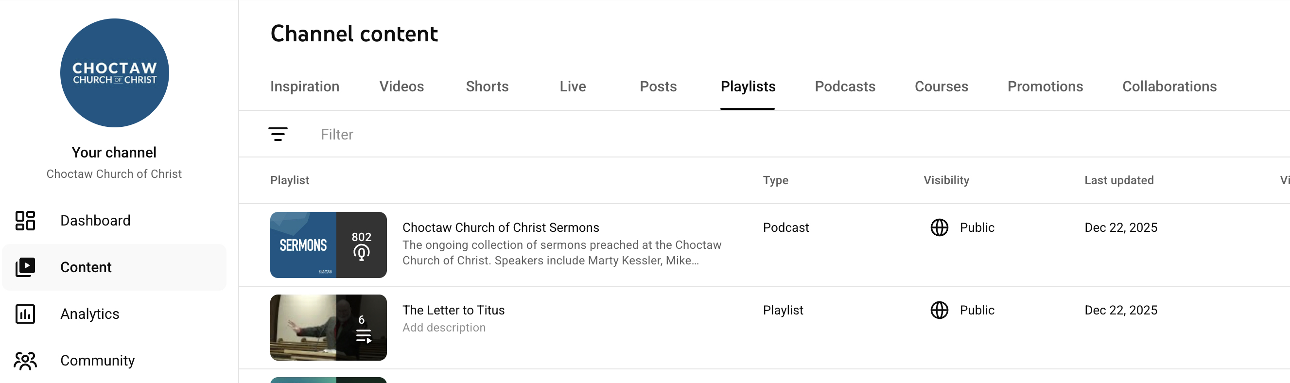 Inside of YouTube Studio, create a playlist and add your episodes to your playlist. Then tap into the Playlist which is a sub page of Content.