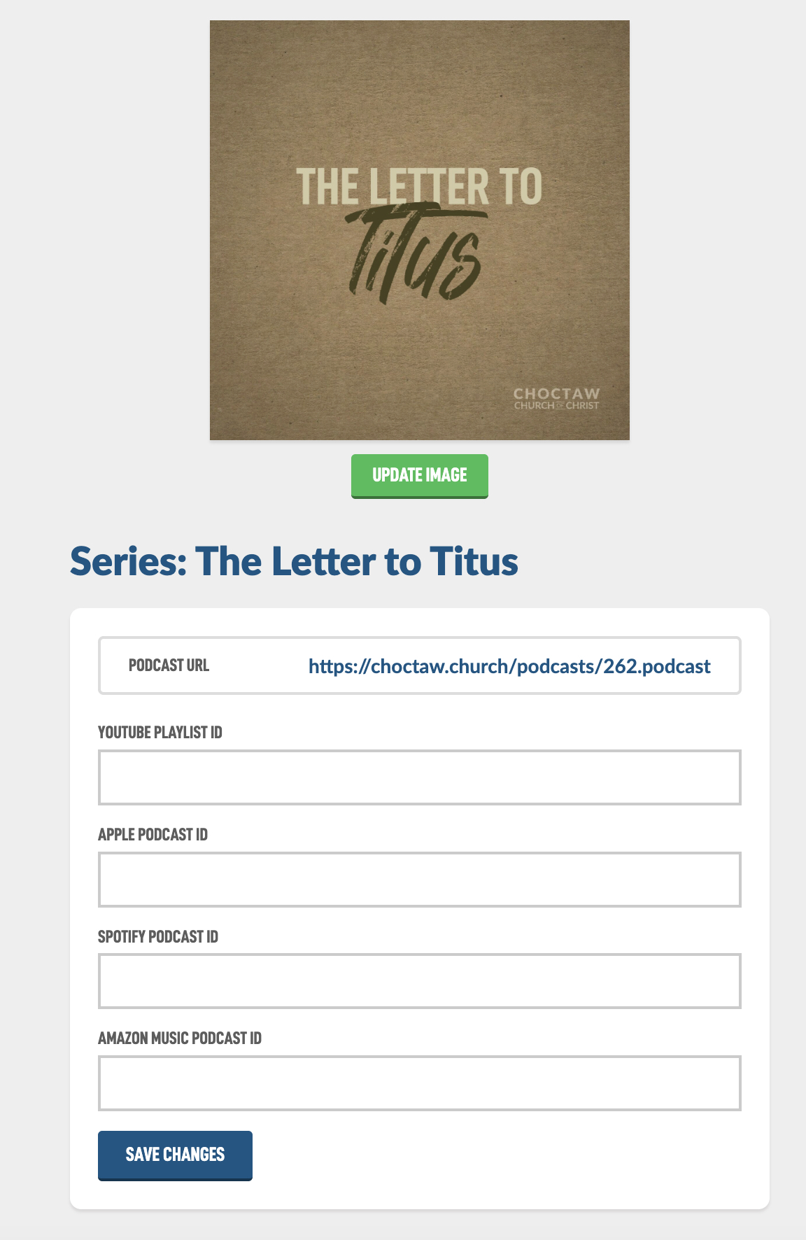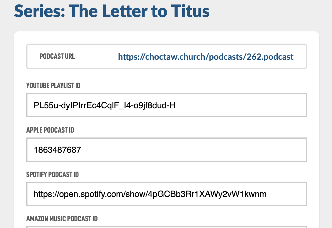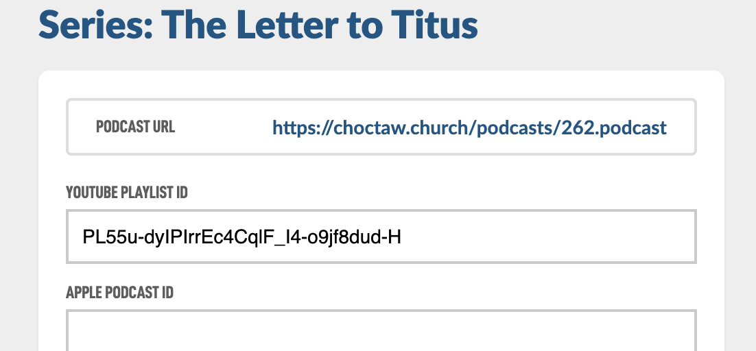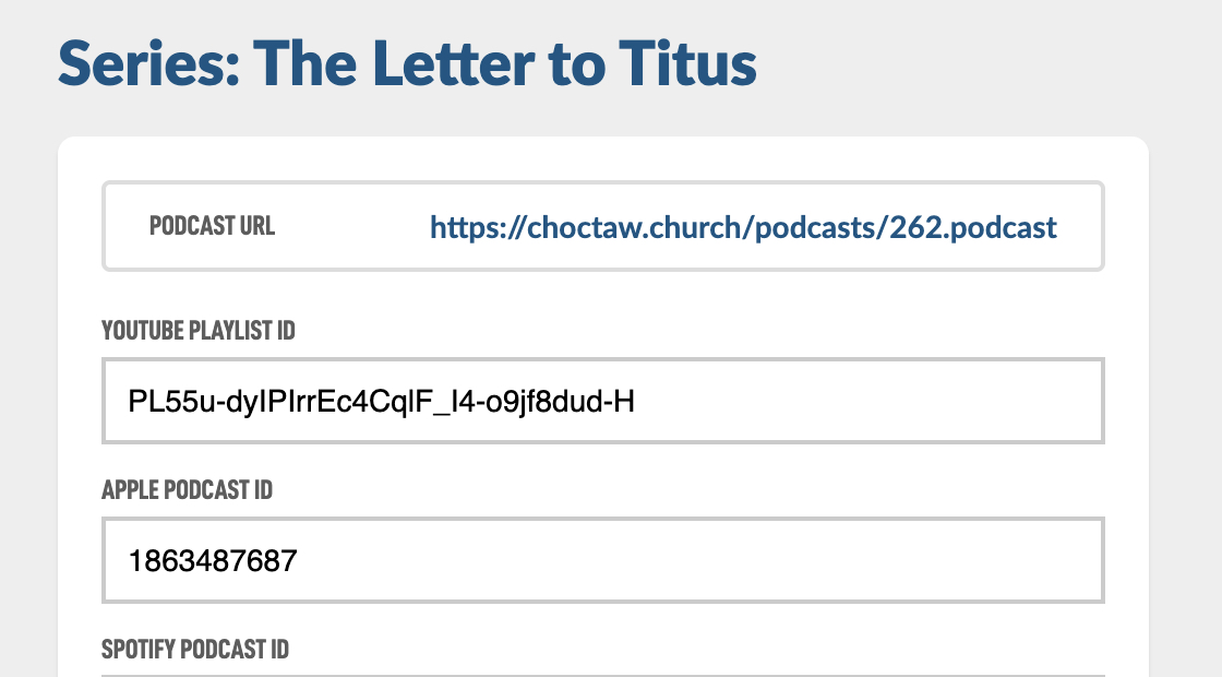 For this Help Guide we'll be submitting a real podcast from our congregation called The Letter to Titus. Here is our podcast image we created. Here is a Help Guide on creating nice Podcast Images. Also here are the form fields we will need to create.