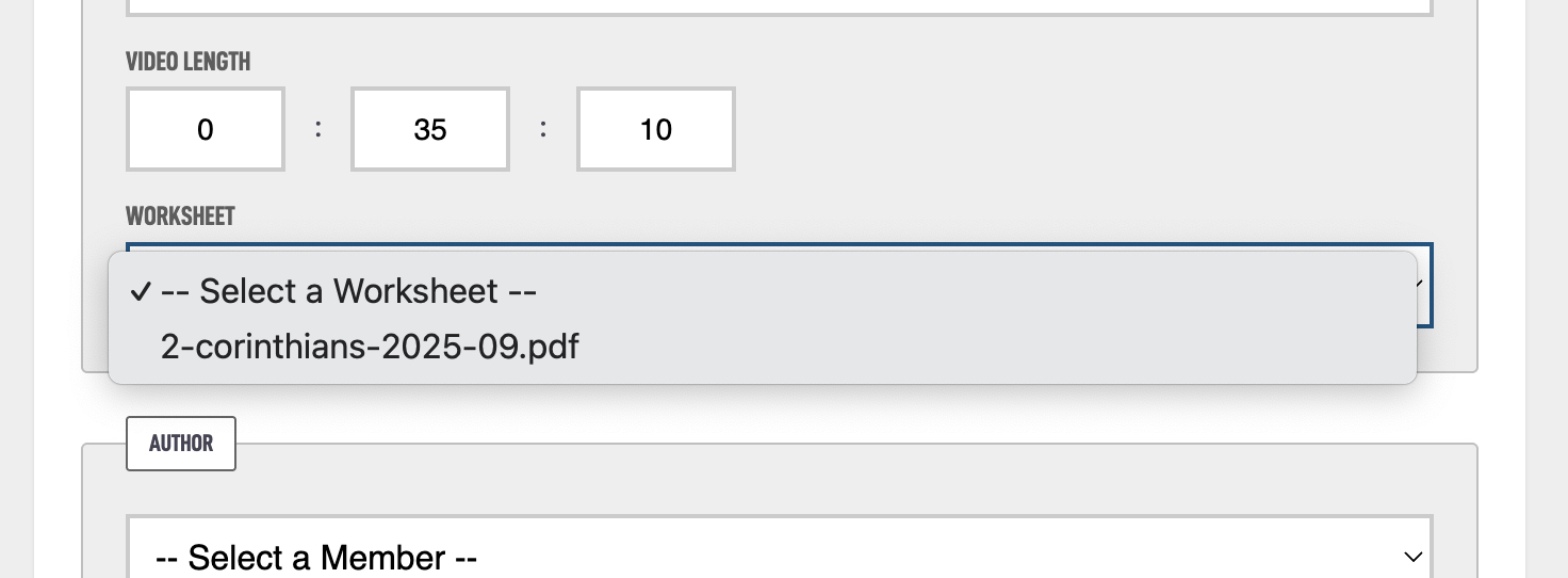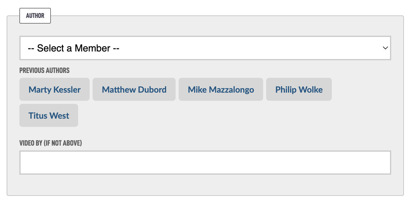The next section of the video form is an Author, you can select a member from your Congregation or a custom name. As you add videos, the most comment authors will start to appear below the Member select box and you can simply tap their names going forward.
