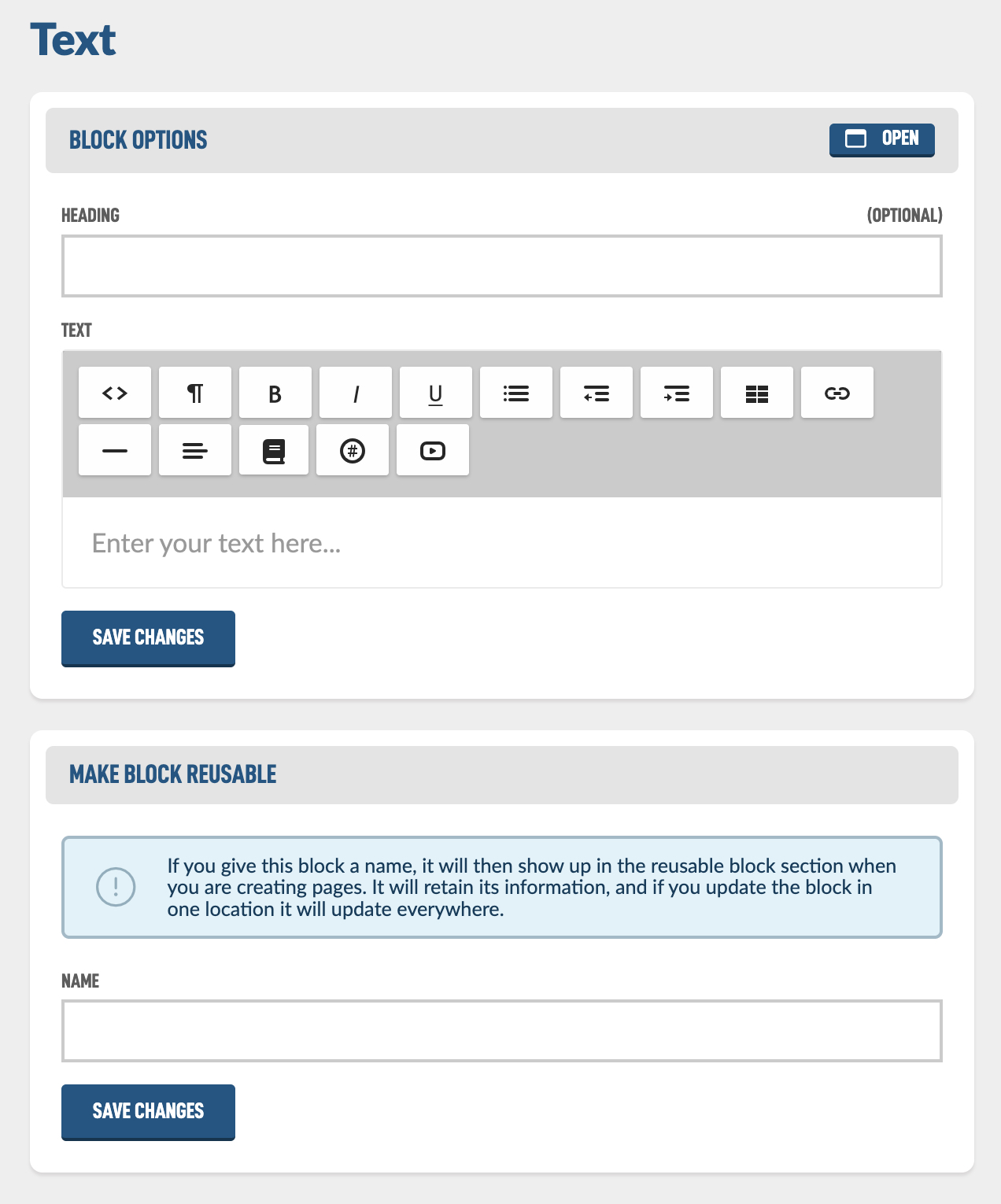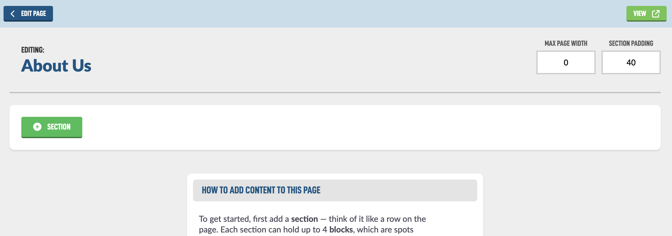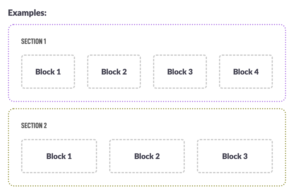 To get started, first add a section — think of it like a row on the page. Each section can hold up to 4 blocks, which are spots where you can place your content. Blocks will automatically adjust to fit the space. You can fill a block with simple text, or with dynamic content like events, articles, or images from your site’s modules.