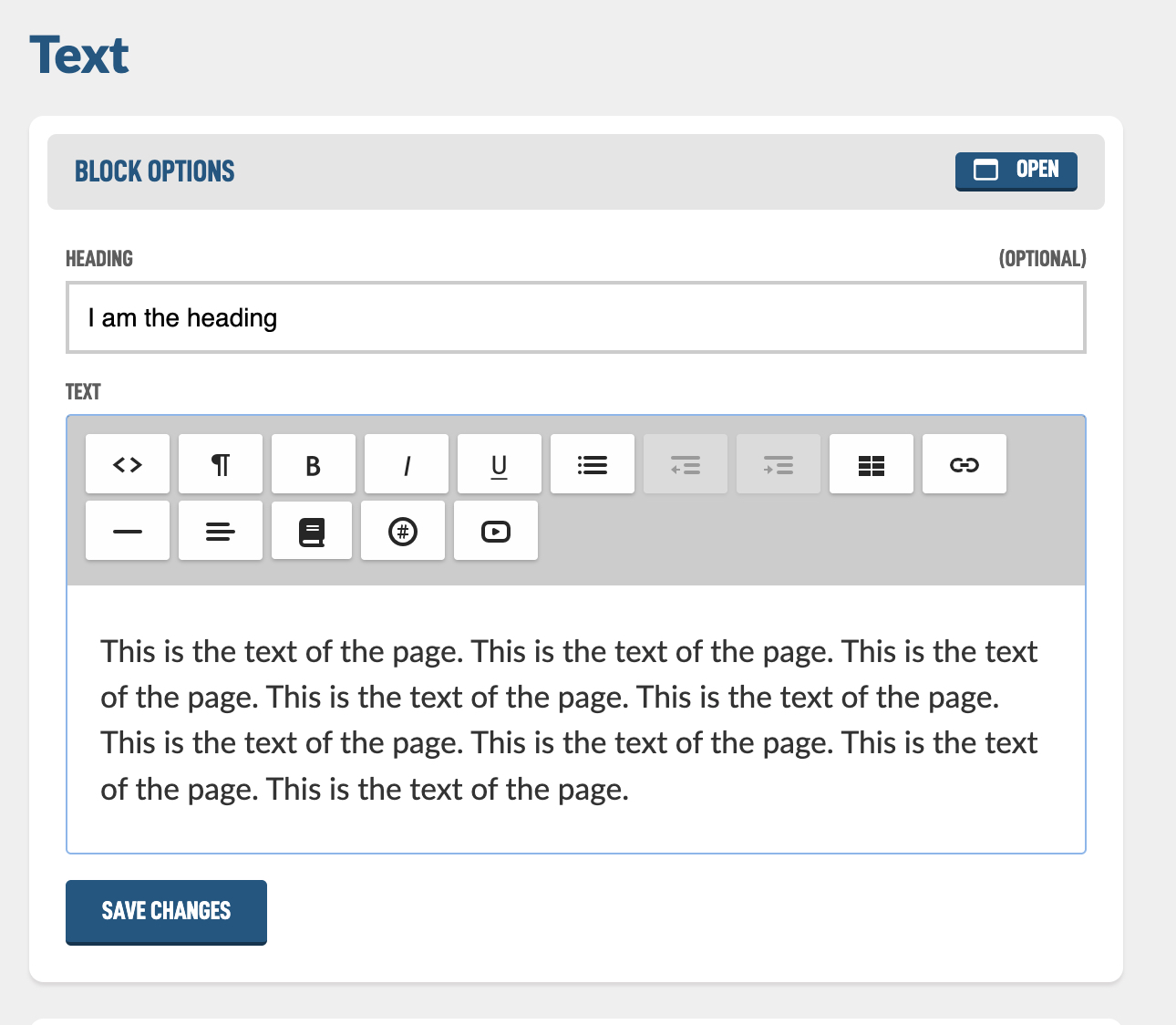 Let's go over these settings. The first is a Heading. This is an optional field to put a title for this block. Just adding some text to it, hitting save and viewing your page will be the easiest way to see how this works. Let's do just that. I will add this text: