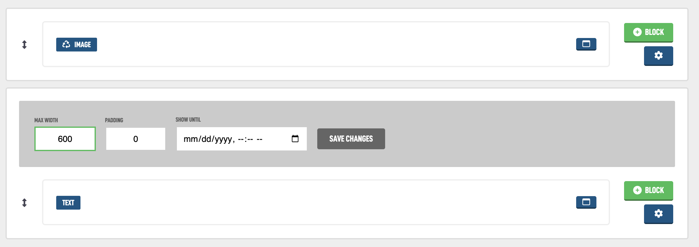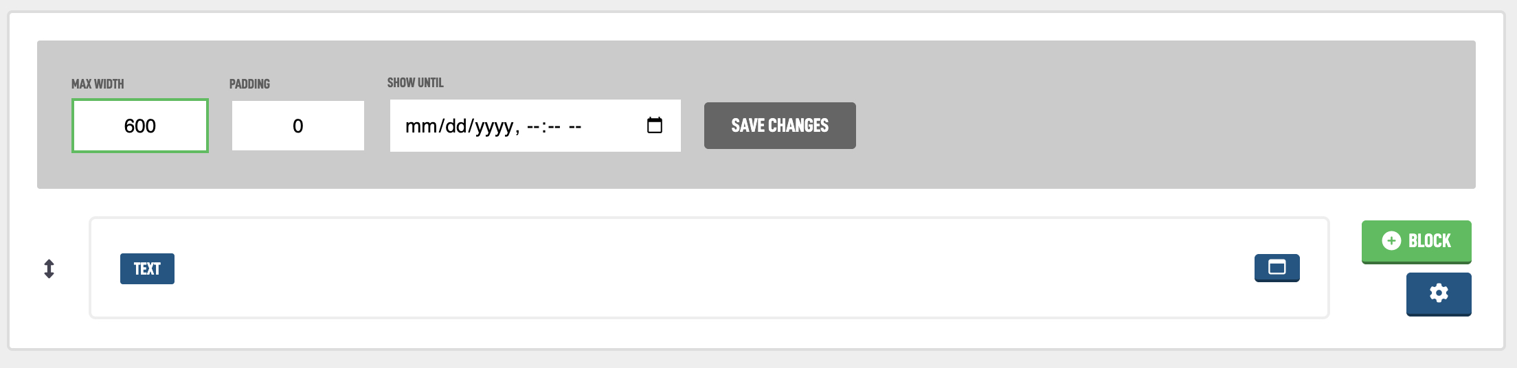 I've also tapped on the boxed icon for the Text block in the bottom section to remove that design and reset my Max Width to 600 to make the text fit better. My admin edit page looks like this.
