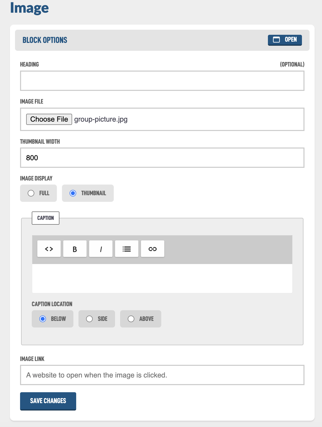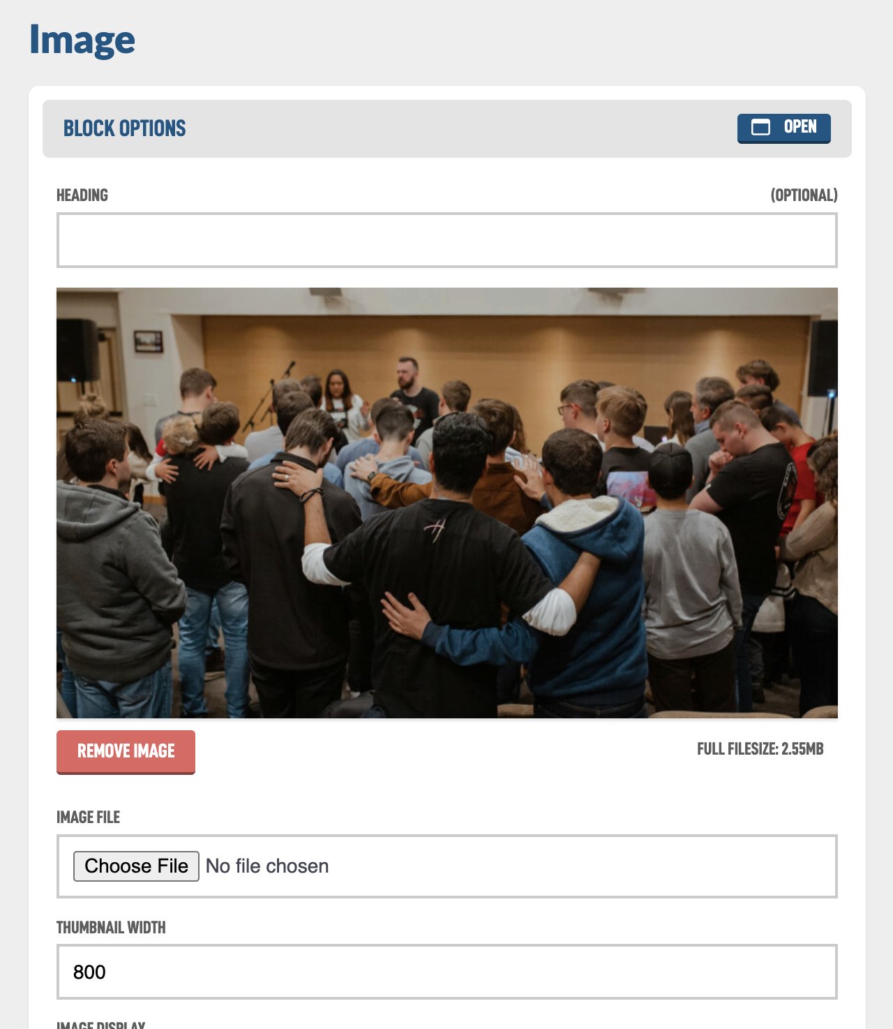 You start with the same Heading option, all blocks have a Heading option for consistency. Then you can choose the main Image File you want to add.