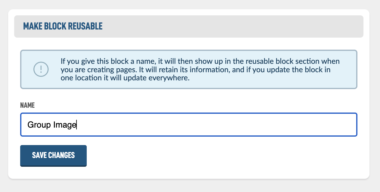 If you continue to the bottom of the page, you should see a Make Block Reusable section. If we give this block a Reusable name it can be used on multiple pages. Let's call it Group Image.