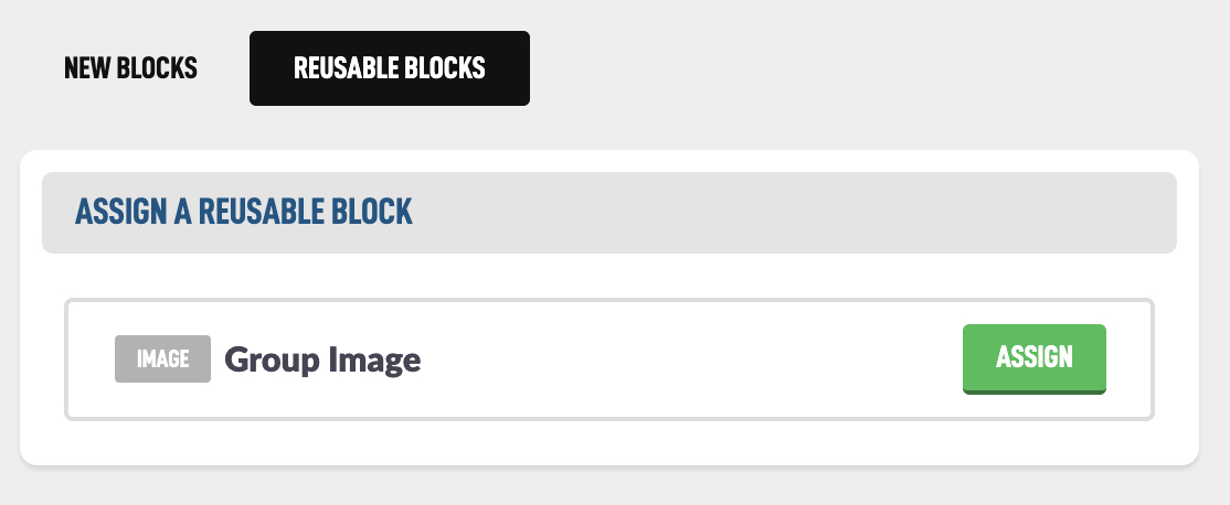 Instead of choosing a New Block, look for the Reusable Blocks filter and select that and you should see our new Group Image block.