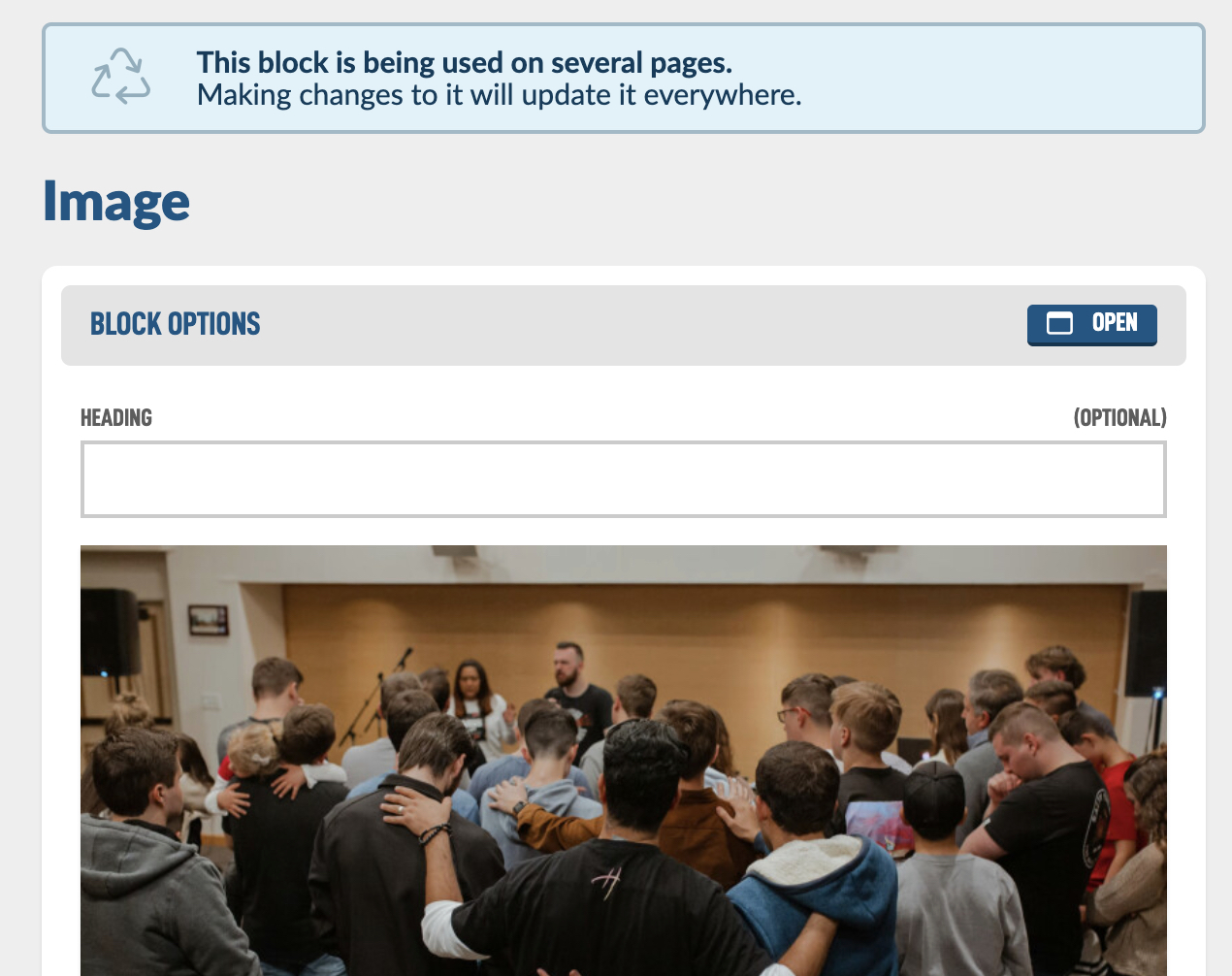 After hitting Assign you will be on the edit page for that Image but you will see a recycle message at the top letting you know that if you change anything in this block it will be updated on every page that contains this block. That can be a great thing or a bad thing if you were not expecting that.